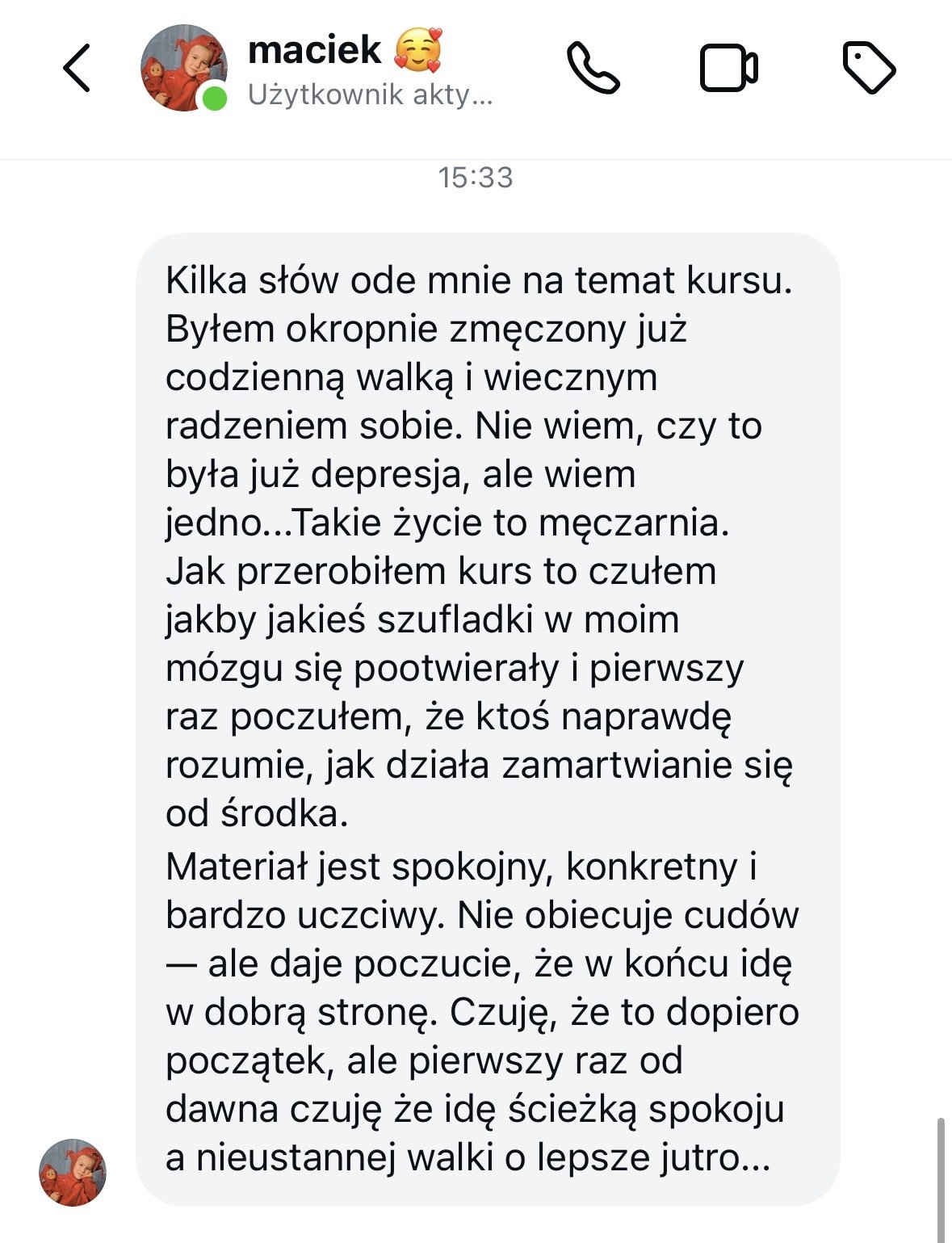 oczekujesz indywidualnej psychoterapii 1:1 i potrzebujesz kontaktu/relacji z terapeutą (to kurs edukacyjny, który nie zastąpi psychoterapii).