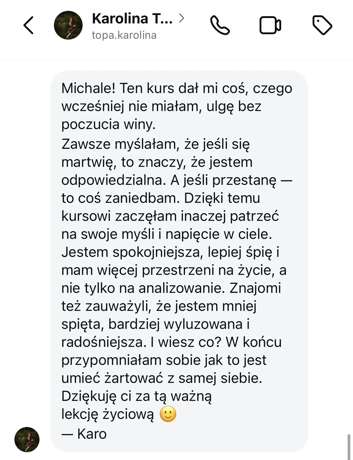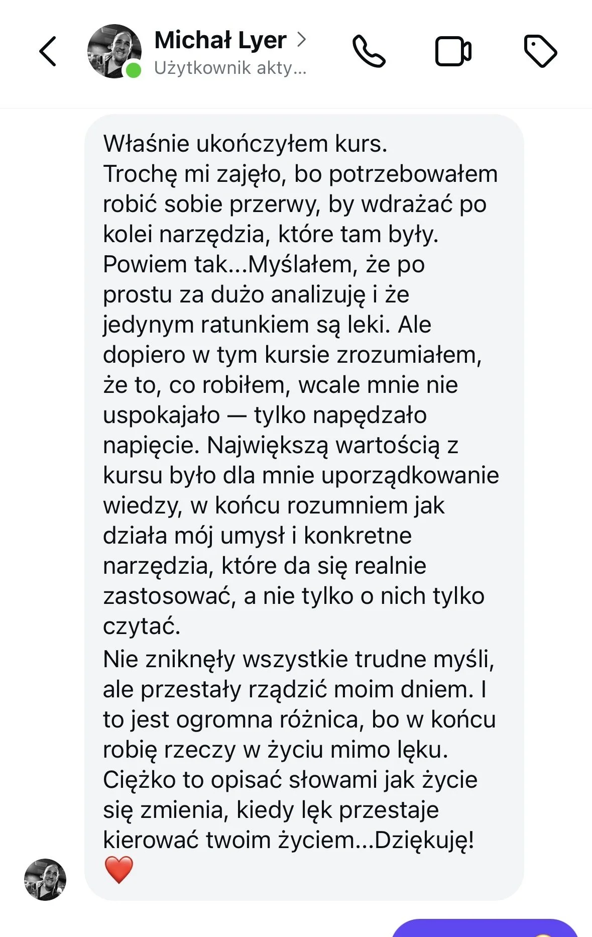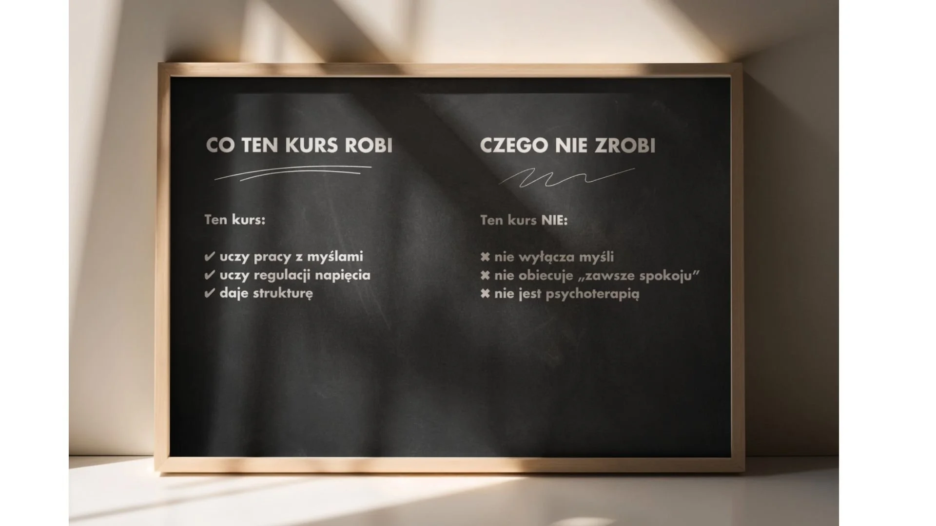 Ten kurs powstał z połączenia mojej pracy klinicznej, własnych doświadczeń oraz podejścia poznawczo-behawioralnego. Nie uczę w nim walki z lękiem ani „pozytywnego myślenia”, lecz tego, jak zrozumieć mechanizm zamartwiania się i przestać go nieświadomie podtrzymywać.