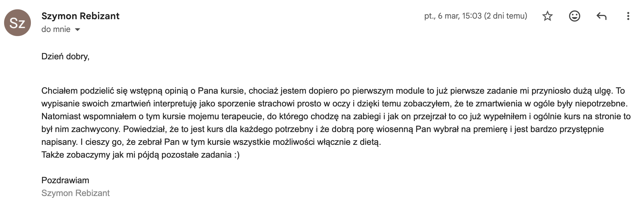 *Kontakt mailowy - konsultacja edukacyjna dotycząca realizacji kursu: do 5 wiadomości mailowych, pytania o wdrażanie technik, trudności w pracy z materiałem, doprecyzowanie ćwiczeń. Odpowiedzi mają charakter edukacyjny i dotyczą treści kursu. Nie stanowią psychoterapii ani konsultacji diagnostycznej.